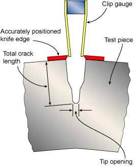 시험은 시편을 2점 굽힘에 놓고 균열 개구량을 측정하여 수행됩니다. 이것은 가공된 노치의 입구에 있는 두 개의 정확하게 배치된 칼날 사이에 배치된 클립에 부착된 스트레인 게이지를 통해 수행됩니다(그림 <>)