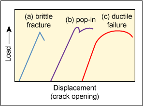 균열의 길이와 노치 입구의 개구부가 알려져 있기 때문에 간단한 기하학으로 균열 선단 개구부를 계산하는 것은 간단한 문제입니다. 테스트가 진행되는 동안 결과는 하중/변위 차트에 자동으로 기록됩니다(그림 4). 이것은 생성될 수 있는 곡선의 다양한 형상을 예시한다 - (a)는 시험편이 소성 변형이 거의 또는 전혀 없이 취성 방식으로 파단된 시험이다. (b) 취성 균열이 시작되지만 더 단단한 재료에서 체포되기 전에 짧은 거리에서만 전파되는 '팝인'을 나타냅니다 - 이것은 곡선에 톱니 모양을 부여하거나 이 한 번의 팝인 변형 후에 완전히 소성 거동을 나타내는 (c)에서와 같이 연성 방식으로 계속될 수 있습니다.